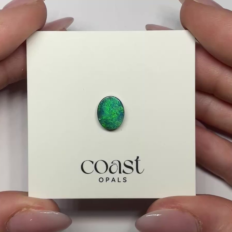 This 2.58ct boulder opal, cut in a 10x8mm oval, displays a dazzling interplay of vivid green and blue in a fine, brushstroke-like pattern. Its seamless play of color gives it a painterly effect, making it a striking gemstone for collectors or for creating an elegant opal centerpiece.