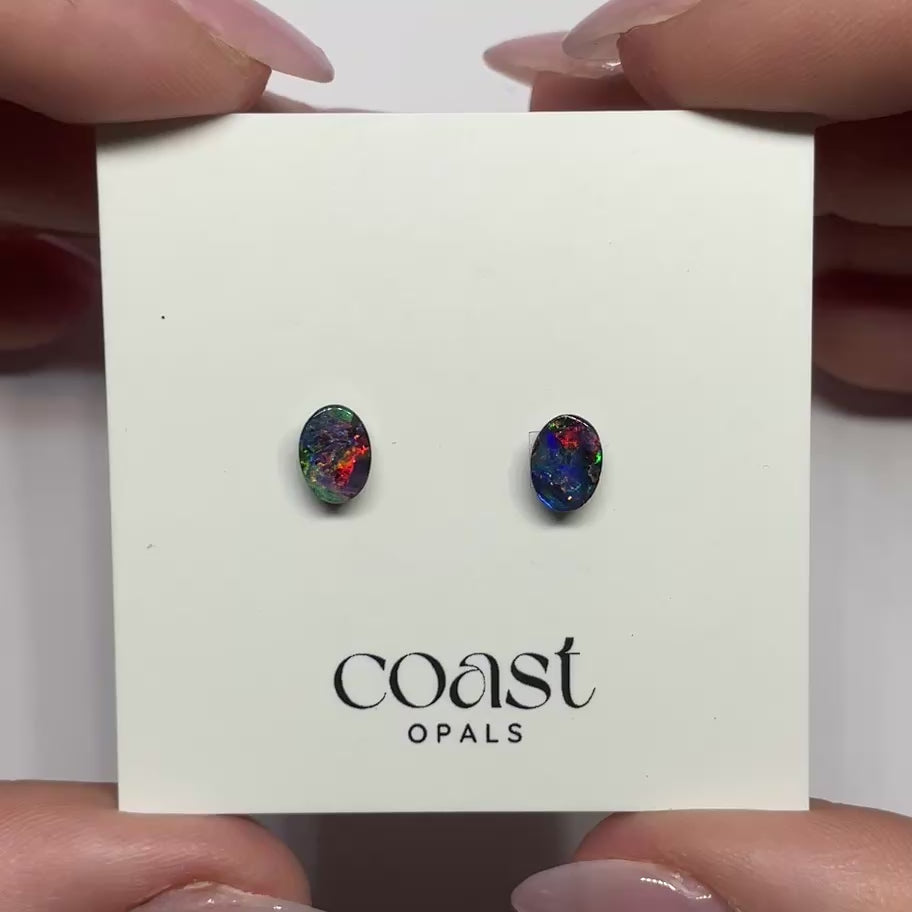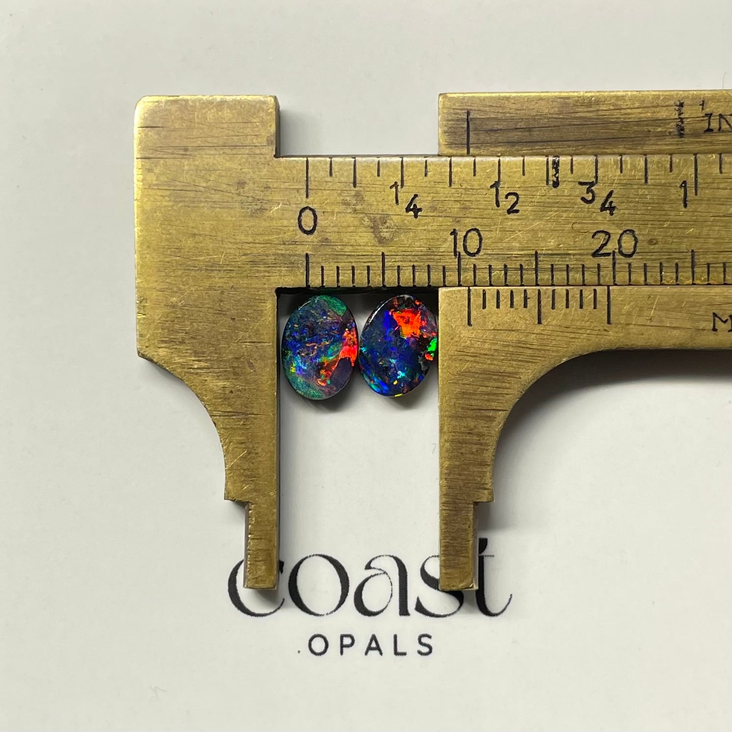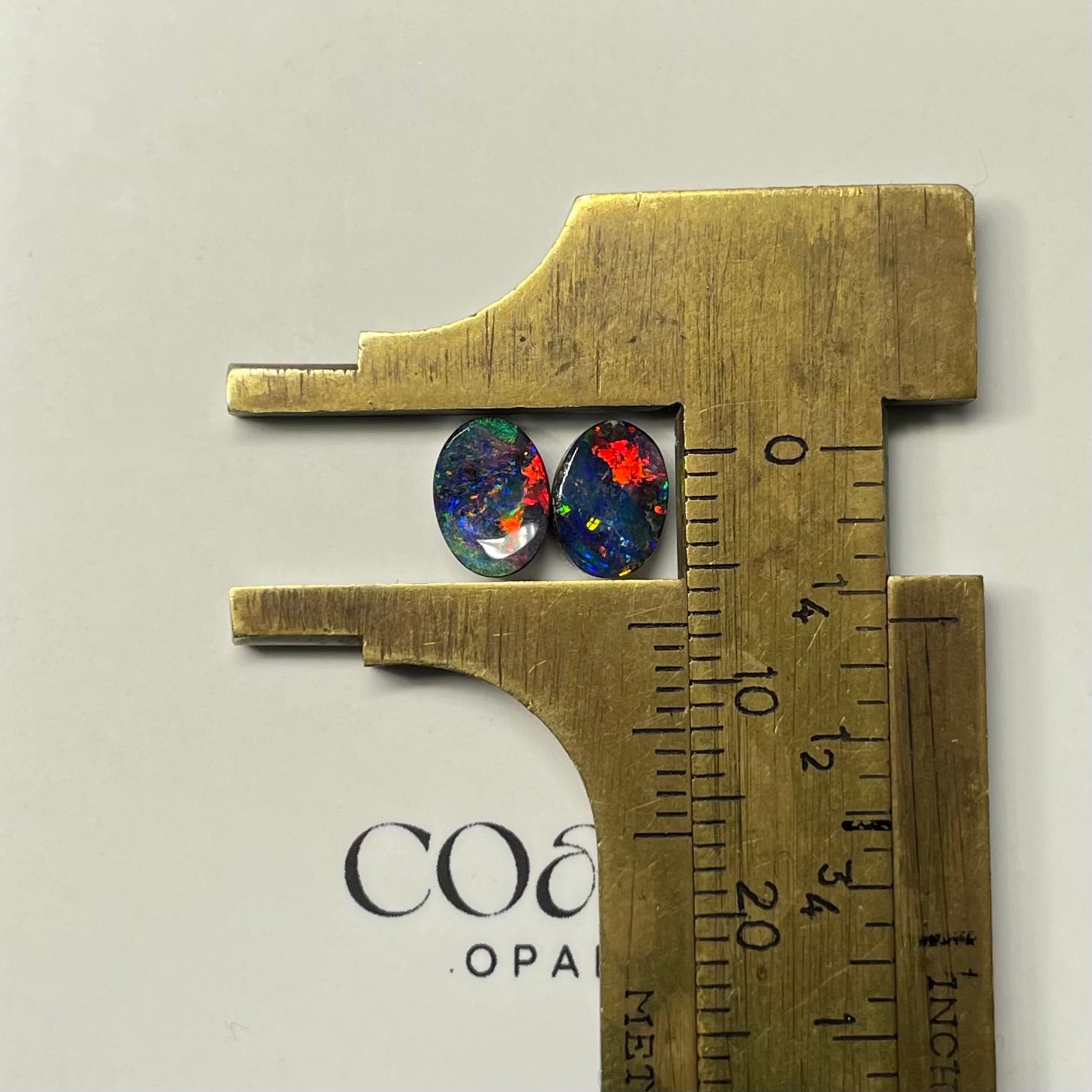 This dazzling 1.74ct opal pair (7 x 5mm each) bursts with fiery red, electric green, and deep blue. Their perfectly balanced play-of-colour creates a striking visual impact, ideal for elegant earrings. With their vivid flashes and harmonious symmetry, these stones embody the brilliance and timeless beauty of Australian opals.