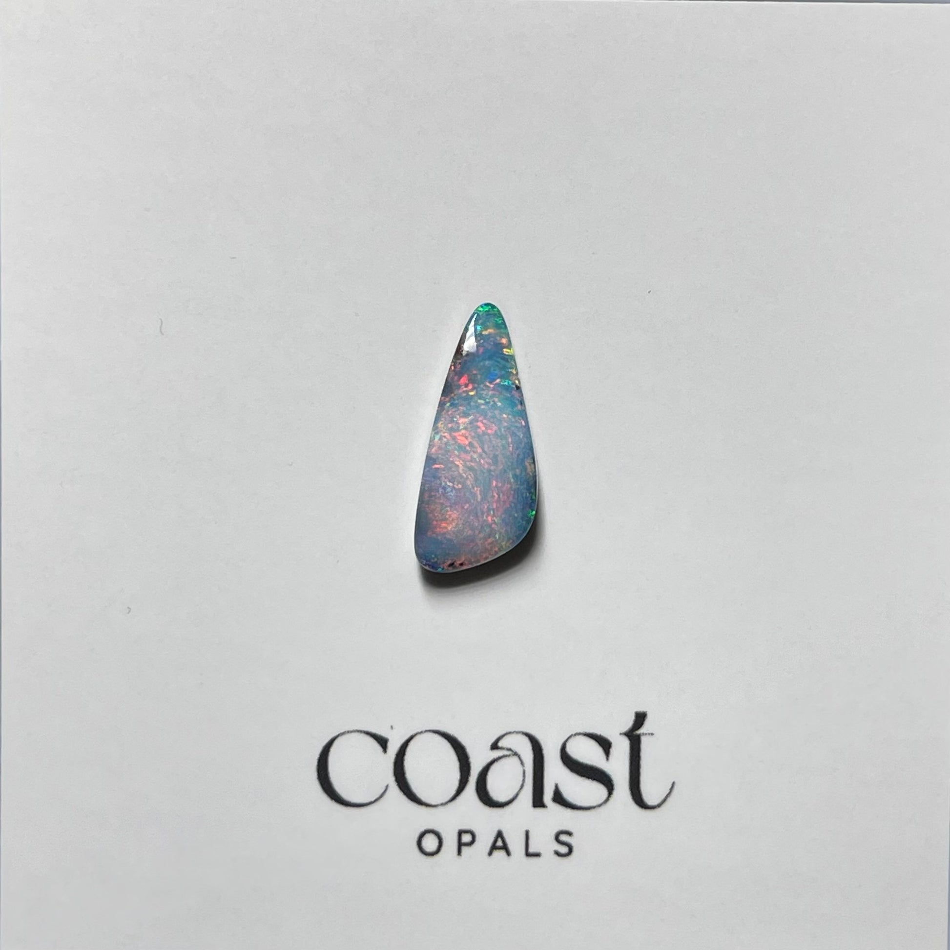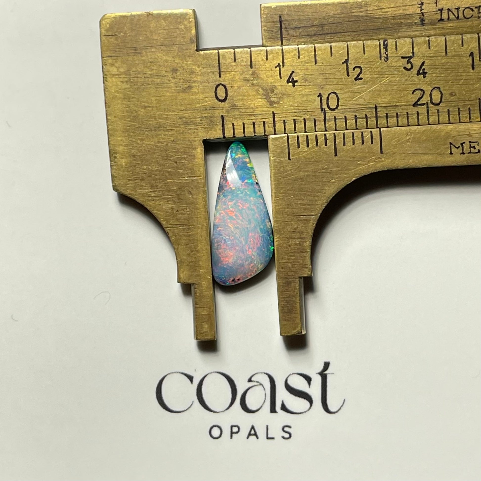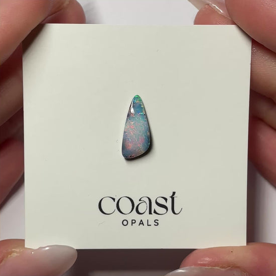 Graceful freeform opal with a soft, translucent base showcasing vibrant flashes of red, green, and orange. Its elegant shape and fiery play of color make it perfect for standout fine jewelry. 2.5ct