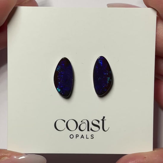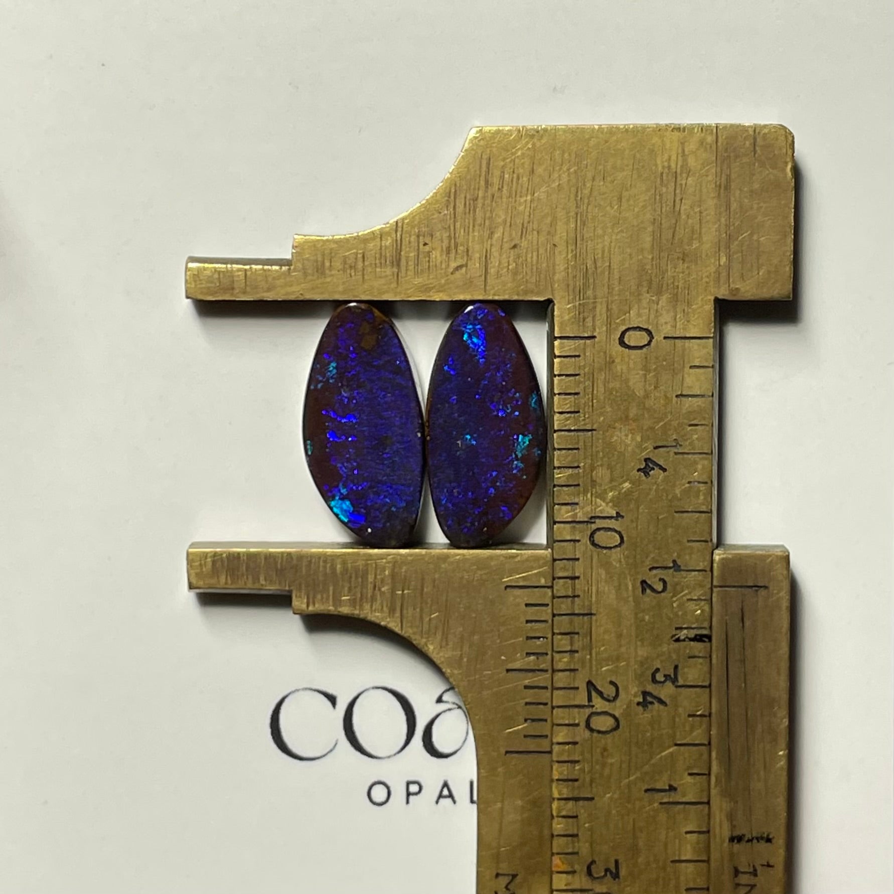 Stunning freeform opal pair with an intense deep blue body tone and subtle electric flecks. Perfectly matched for elegant earrings, these stones evoke a rich night-sky brilliance with refined charm.