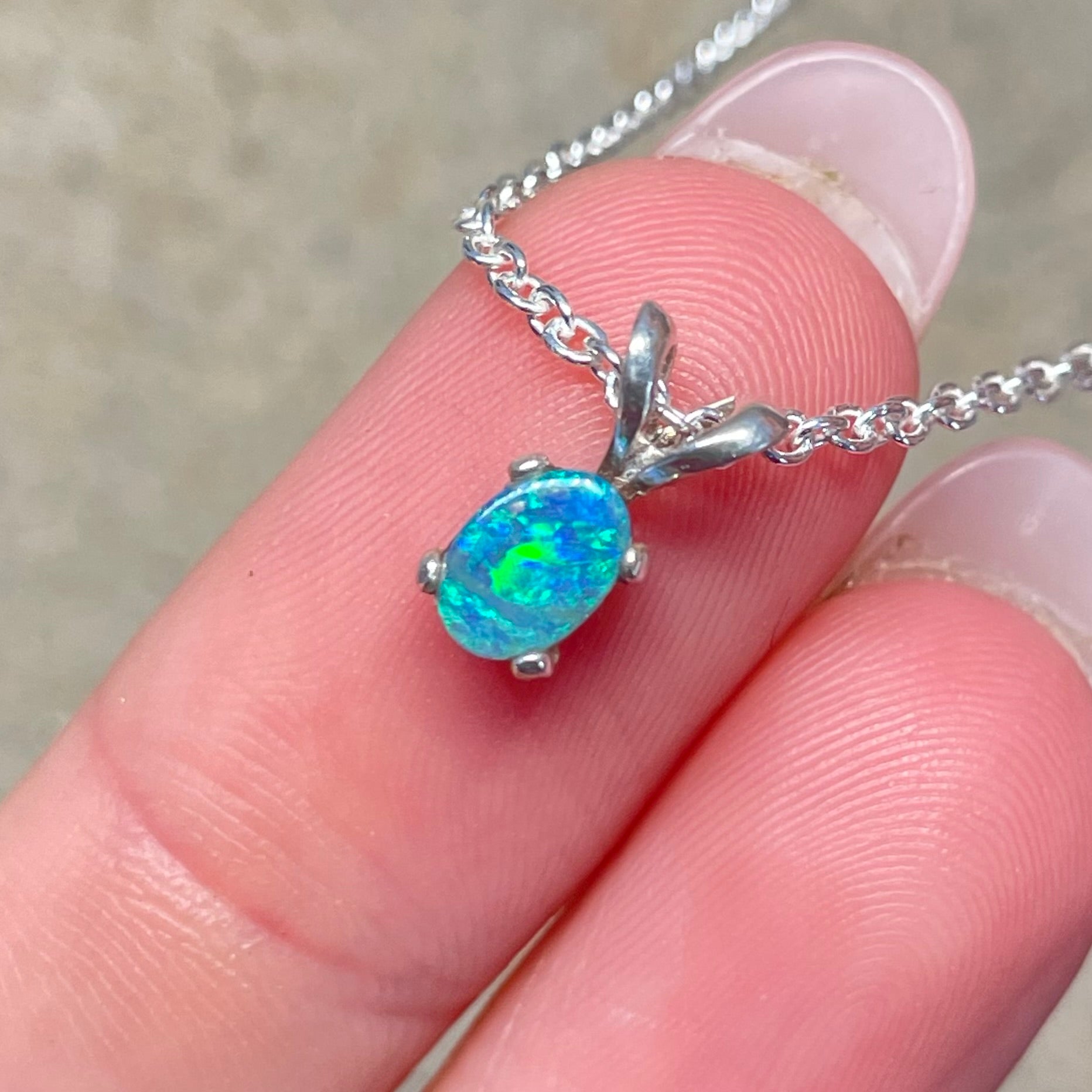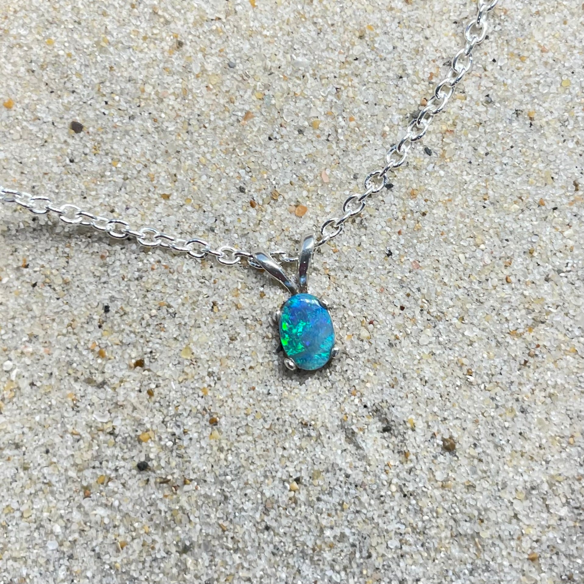 This elegant pendant showcases a 6x4mm oval opal gemstone, glowing with vibrant flashes of blue and green, beautifully set in sterling silver and suspended from a fine, timeless chain.