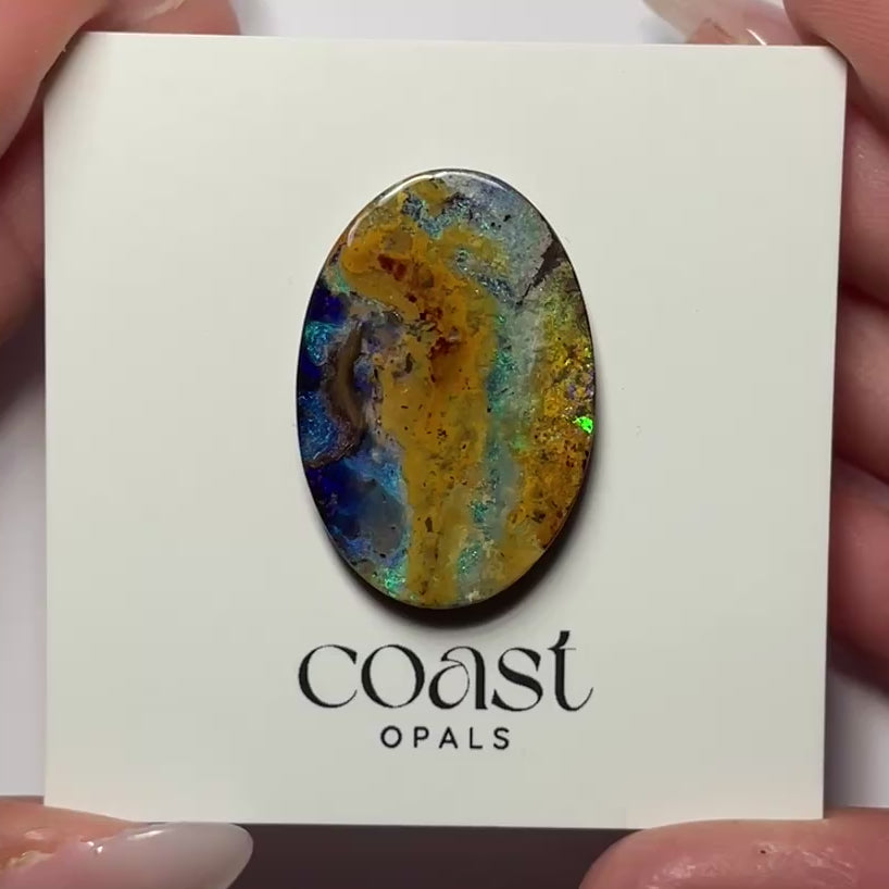 Distinctive oval boulder opal featuring bold ochre tones layered with flashes of electric blue and green. A unique blend of earthy texture and vivid color, ideal for statement jewelry.