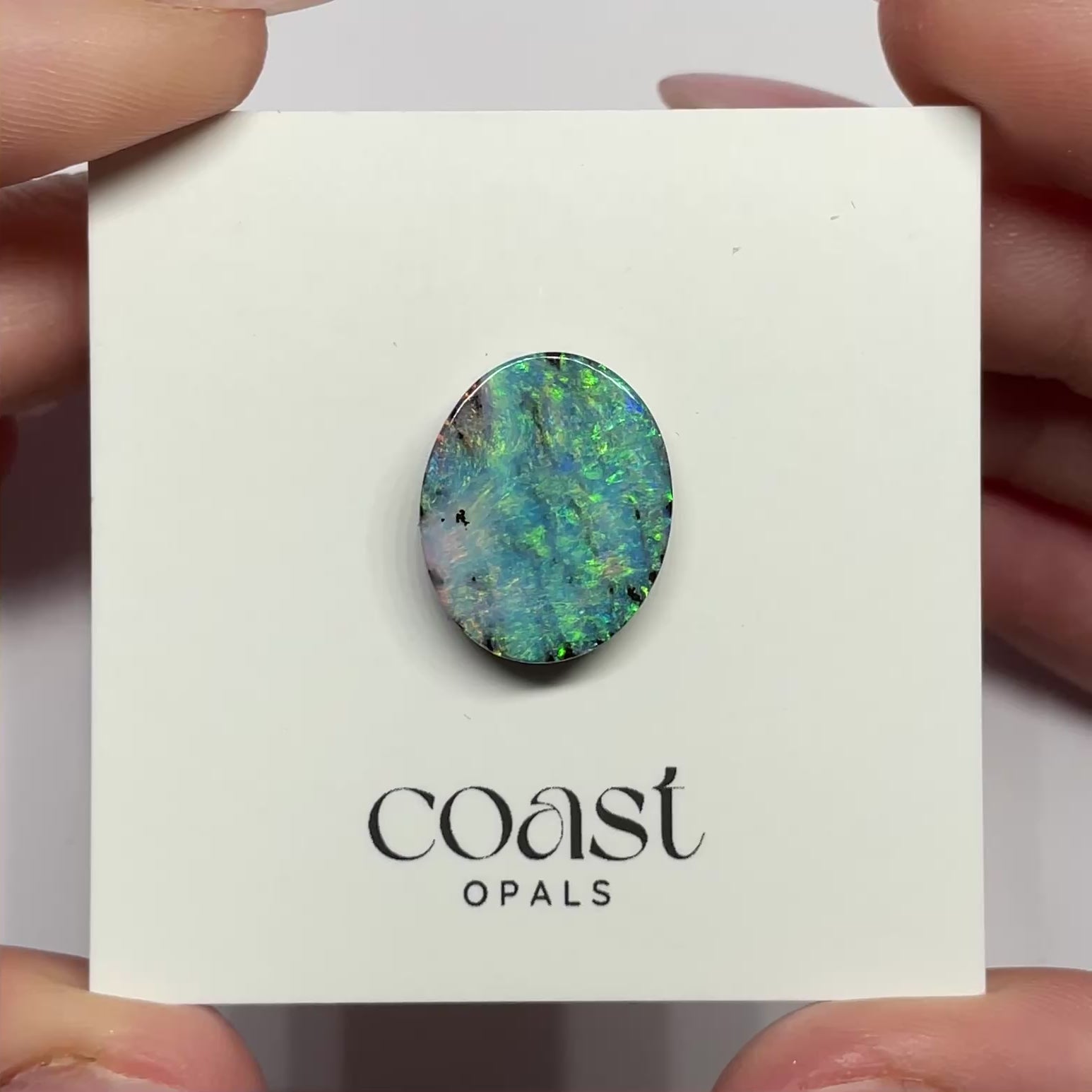 This exquisite 8.5ct Australian Boulder Opal features a captivating play of color with vibrant greens, blues, and flashes of orange. Measuring 17.29 x 14.18mm, its natural matrix enhances the gem’s striking character, making it a stunning choice for collectors or bespoke jewelry designs.