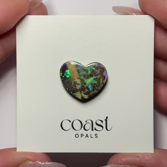 Stunning heart-shaped boulder opal featuring a captivating mix of earthy matrix and vibrant green, blue, and orange fire. A unique, natural masterpiece perfect for bespoke jewelry or collectors.