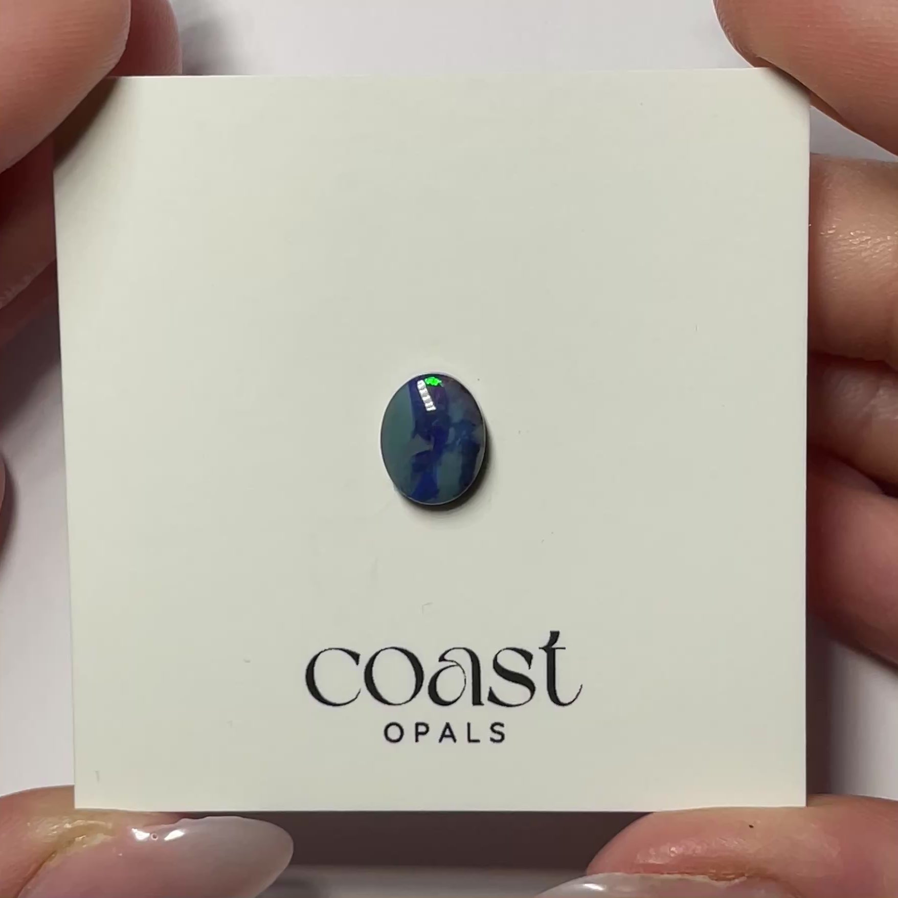 Elegant oval opal featuring a cool blue base with subtle swirling patterns and bright green highlights. Its refined polish and serene tones suit both modern and classic jewelry designs.