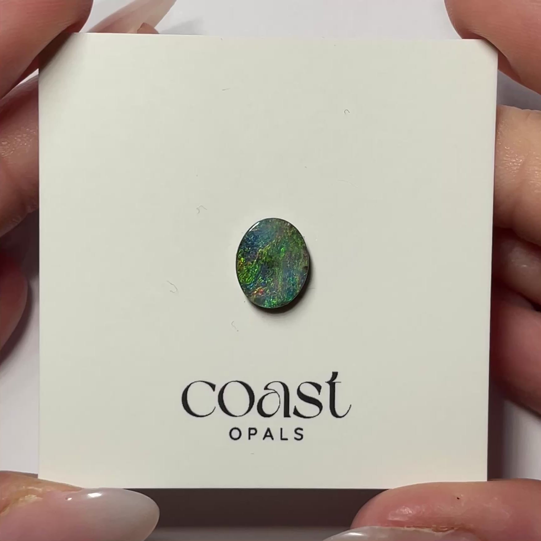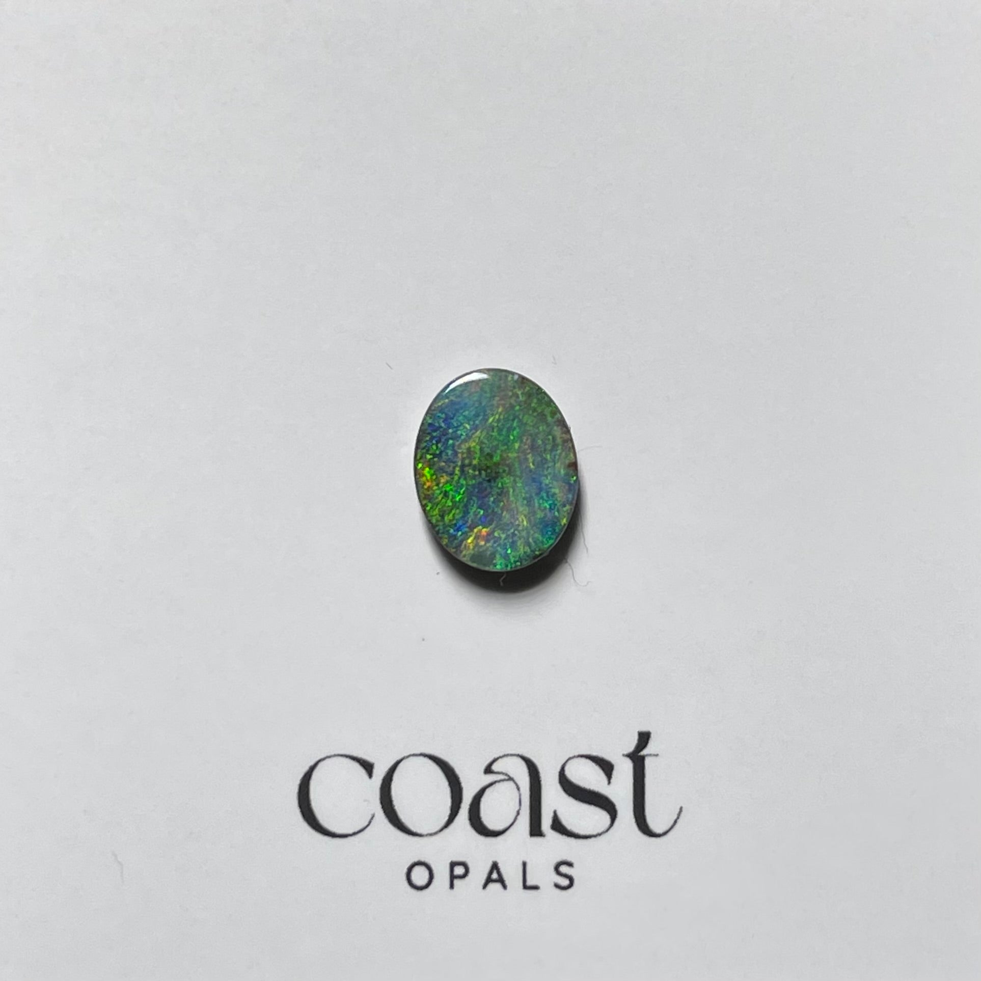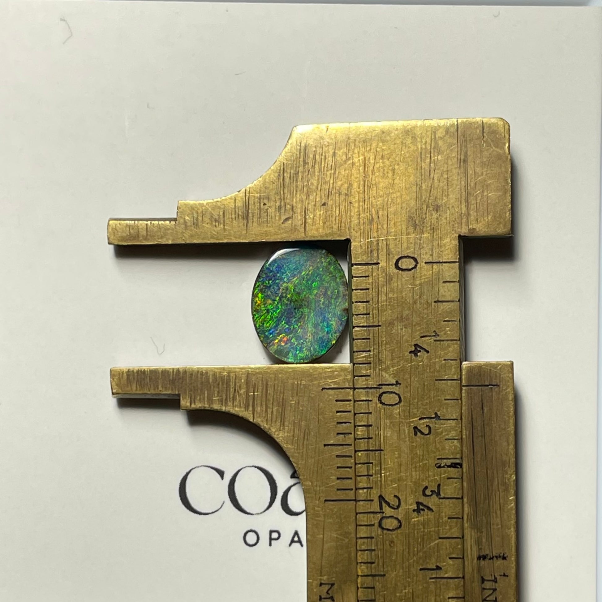 Striking oval opal with a deep base tone and vibrant green, blue, and yellow flashes. Its natural patterning and polished finish make it ideal for timeless fine jewelry settings.