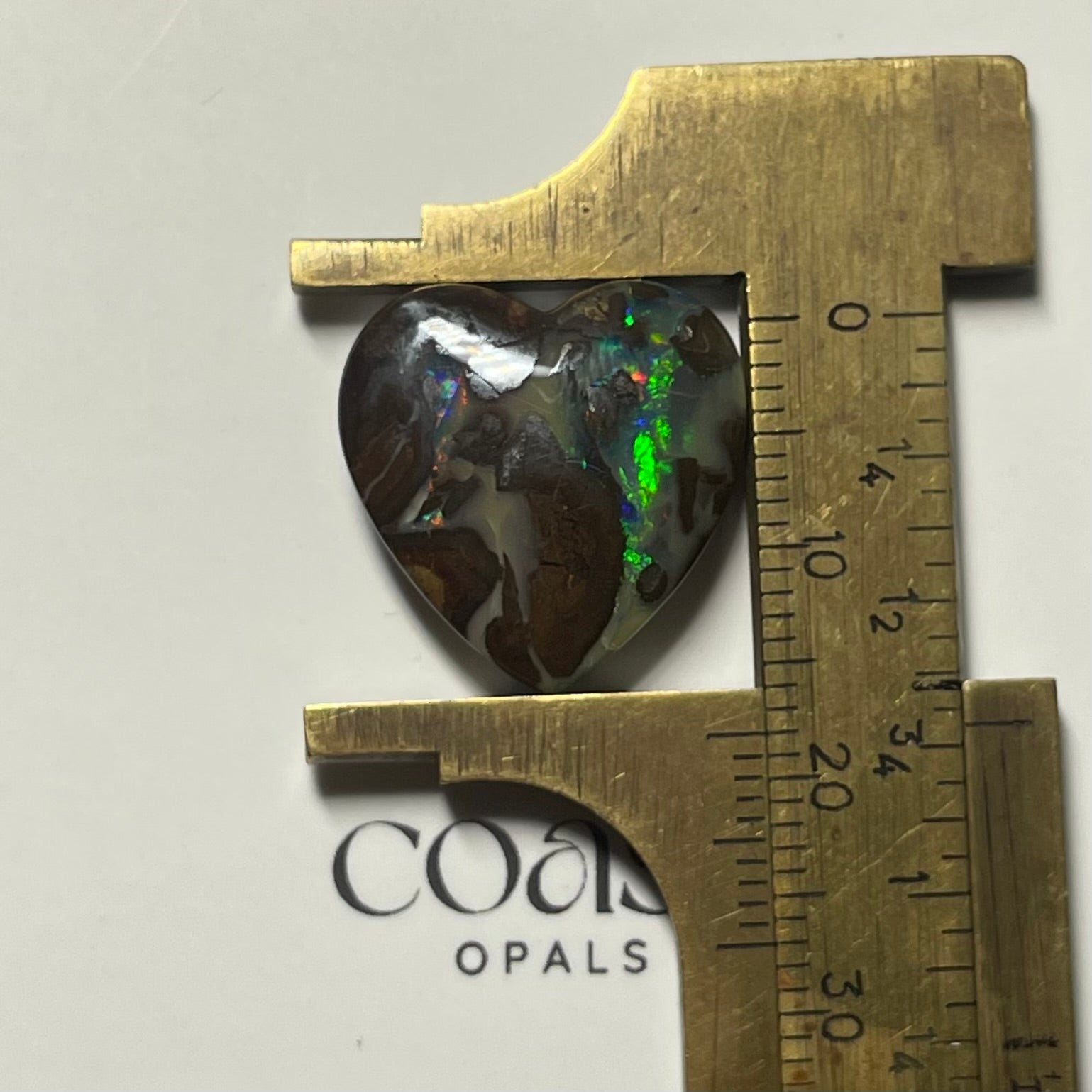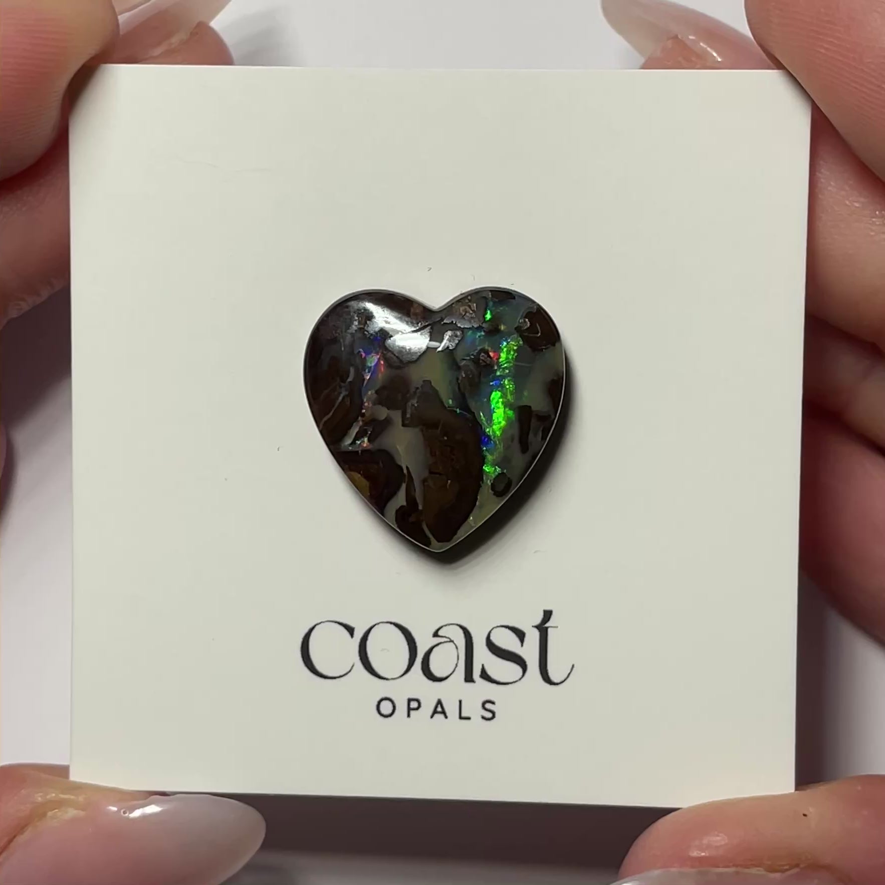 Beautiful heart-shaped boulder opal blending earthy brown matrix with vivid green and blue flashes. A naturally artistic piece, ideal for custom jewelry or meaningful keepsakes.