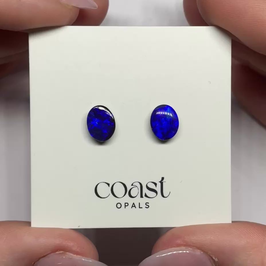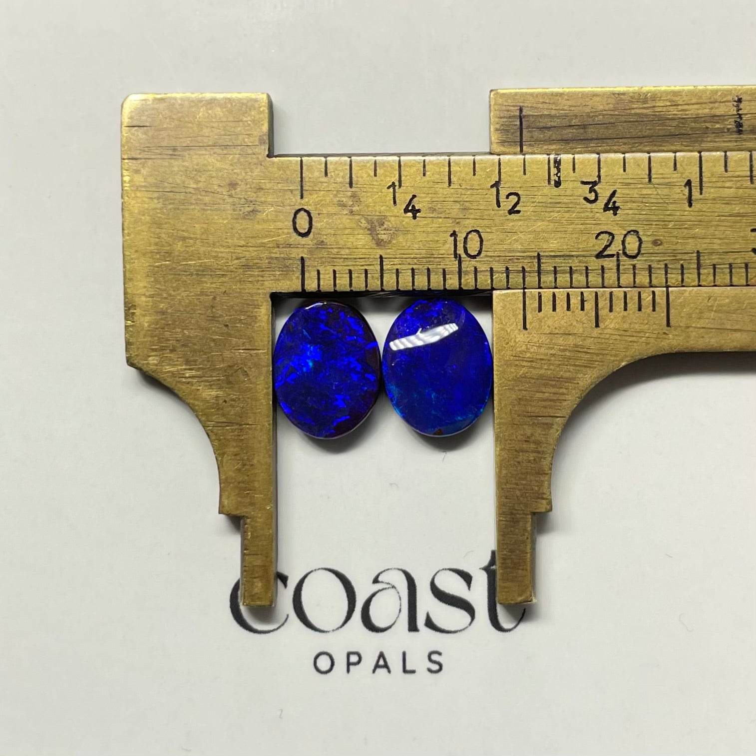 This striking 3.68ct opal pair (9 x 7mm each) radiates an intense midnight blue with flashes of deep violet. Their perfectly matched hues create harmony and balance, making them ideal for elegant earrings. Bold yet refined, this opal pair brings sophistication and brilliance to any jewellery design.