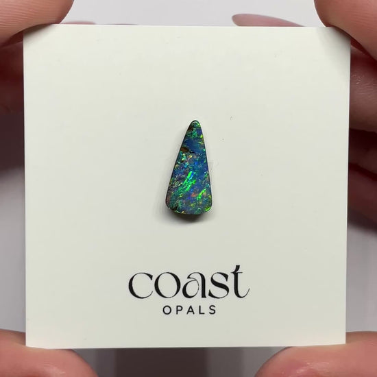 This elegant 2.5ct Australian Boulder Opal displays a vibrant play of green, blue, and fiery orange flashes across its polished surface. Measuring 14.61 x 7.32mm, its unique freeform shape makes it a striking centerpiece for fine jewelry or a prized addition to any opal collection.