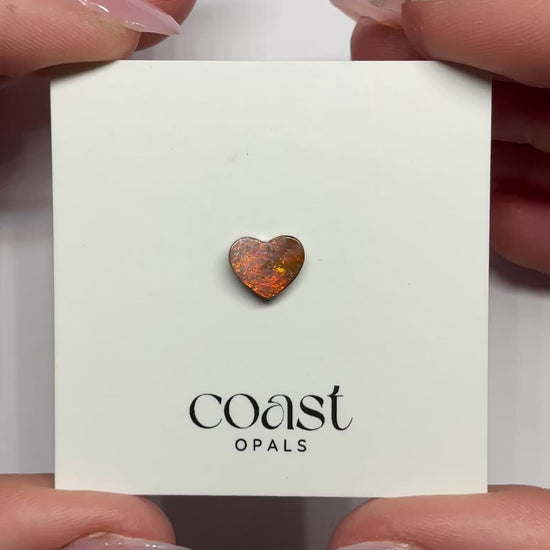 This 1.40ct heart-shaped boulder opal, sized at 7.47 x 8.93mm, radiates with a bold play of red and orange fire, accented by subtle green and gold undertones. Its warm, glowing palette creates a striking presence, making it a perfect centrepiece for jewellery or a passionate addition to any collection.