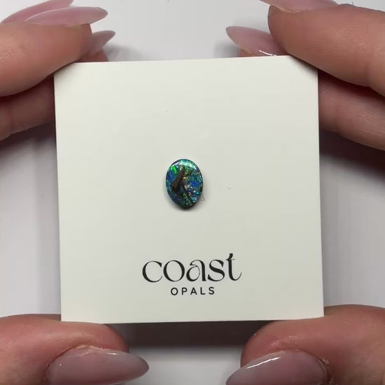 This 1.82ct boulder opal, measuring 9x7mm, showcases vivid flashes of blue, green, and gold, contrasted beautifully by its natural matrix. The interplay of bright fire and earthy inclusions creates a truly unique character. Perfect for collectors or custom jewelry seeking individuality and organic beauty in a compact gem.