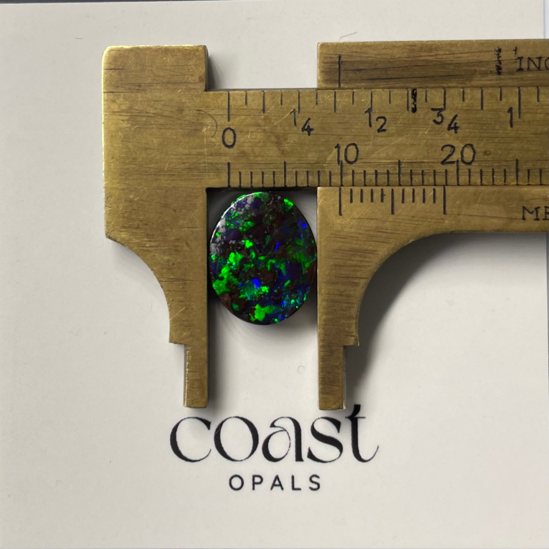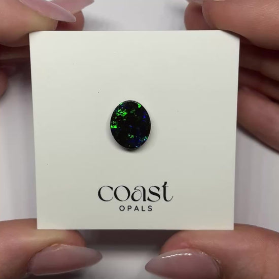 This 3.90ct boulder opal, cut in a 12x10mm oval, radiates with brilliant flashes of electric green and deep blue across a dark base. The intense play of color is striking and bold, making it a perfect centerpiece gem for an opal lover seeking vibrancy and contrast.