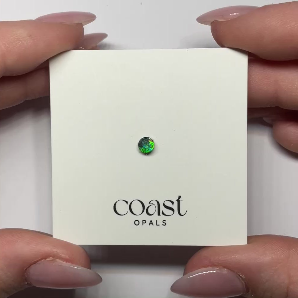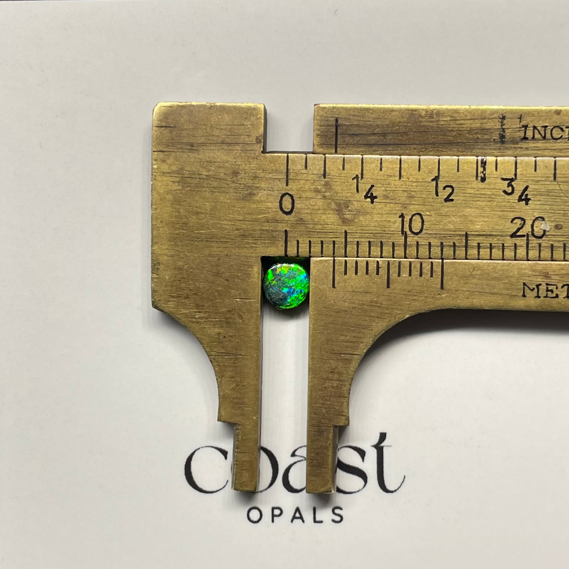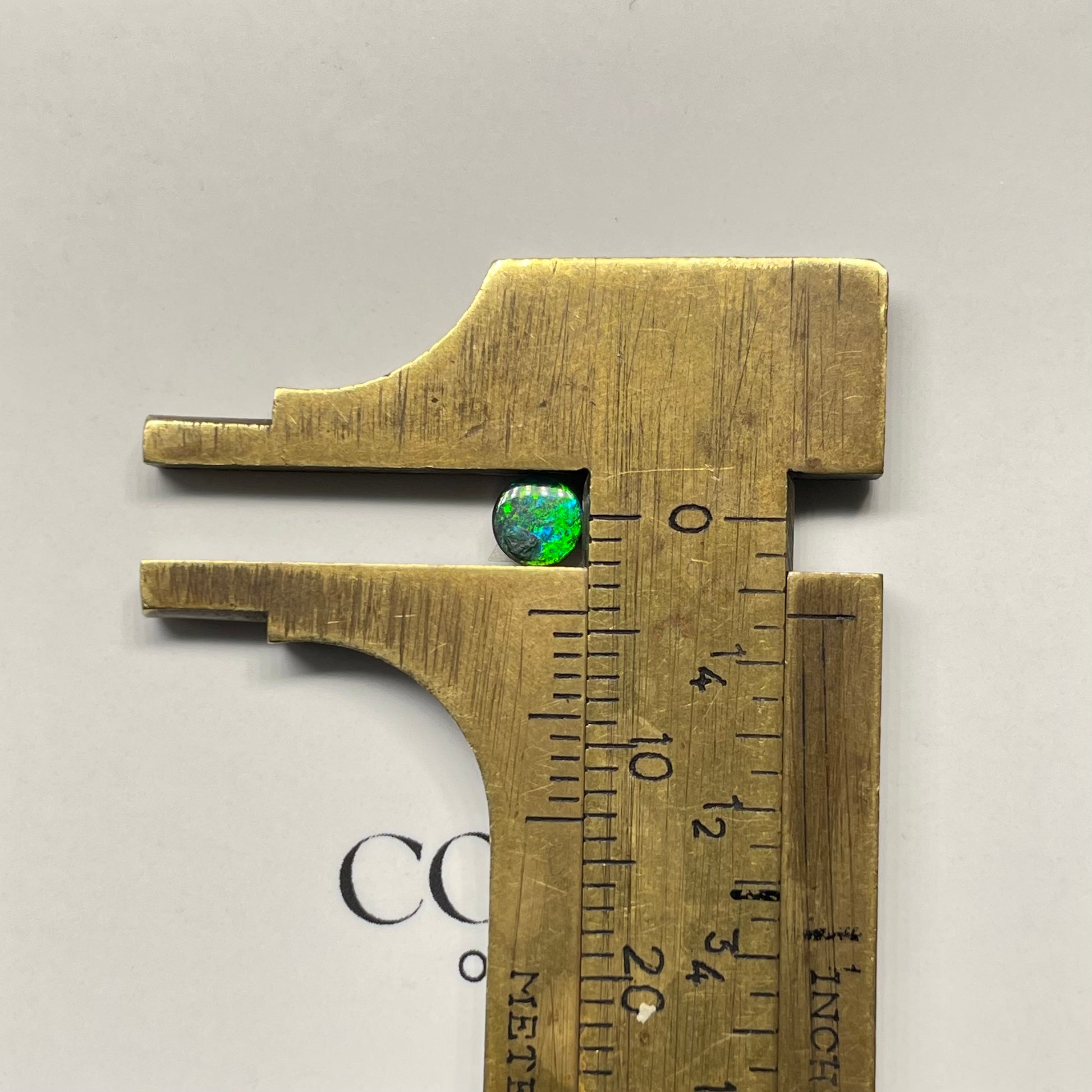 A 5mm round boulder opal weighing 0.33ct, this gem bursts with vivid neon green and electric blue play-of-colour against a dark body tone. Compact yet intensely vibrant, it’s ideal for a dainty ring, pendant, or as a striking accent in a multi-stone opal jewelry design.