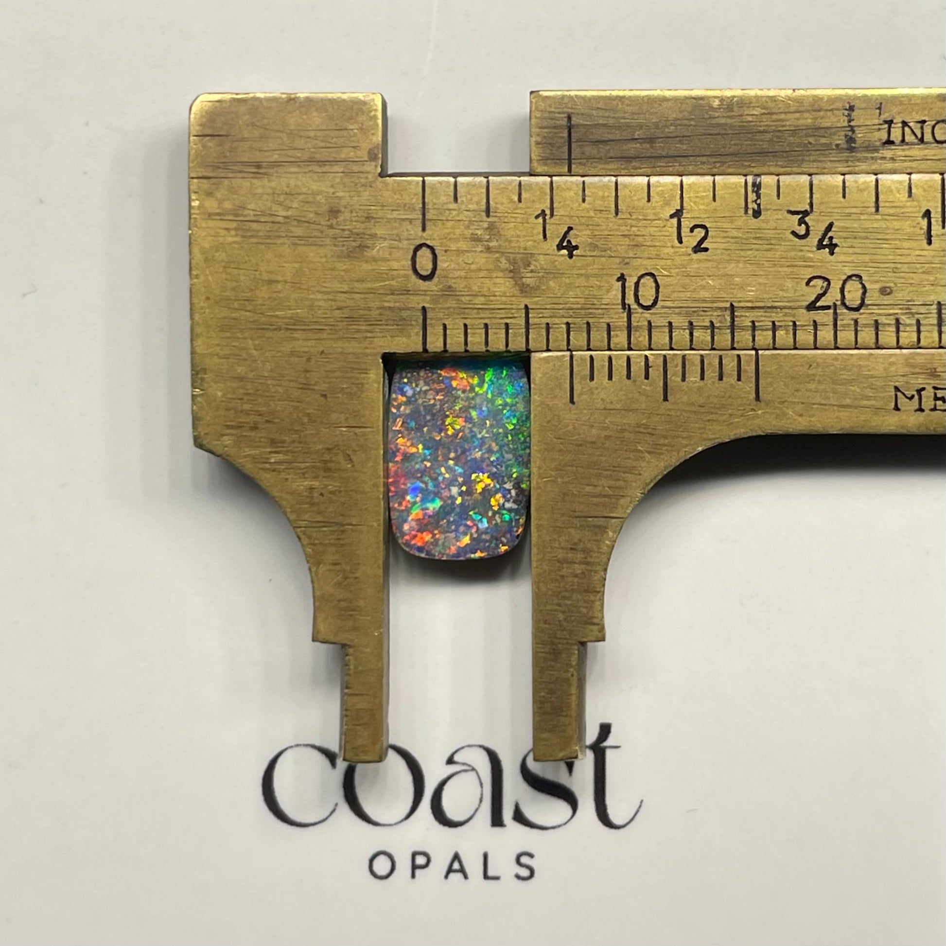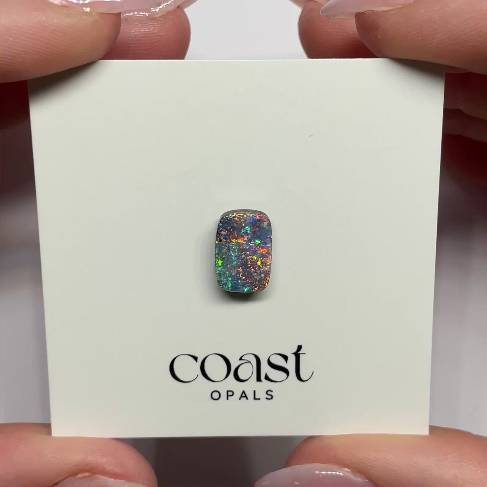 This 2.30ct Australian Boulder Opal, measuring 10.8 x 7.33mm, dazzles with a vibrant mosaic of fiery reds, radiant oranges, and shimmering greens against a dark base. Its rectangular cushion shape enhances the dynamic play of color, making it a striking choice for custom jewelry or an exceptional collector’s piece.