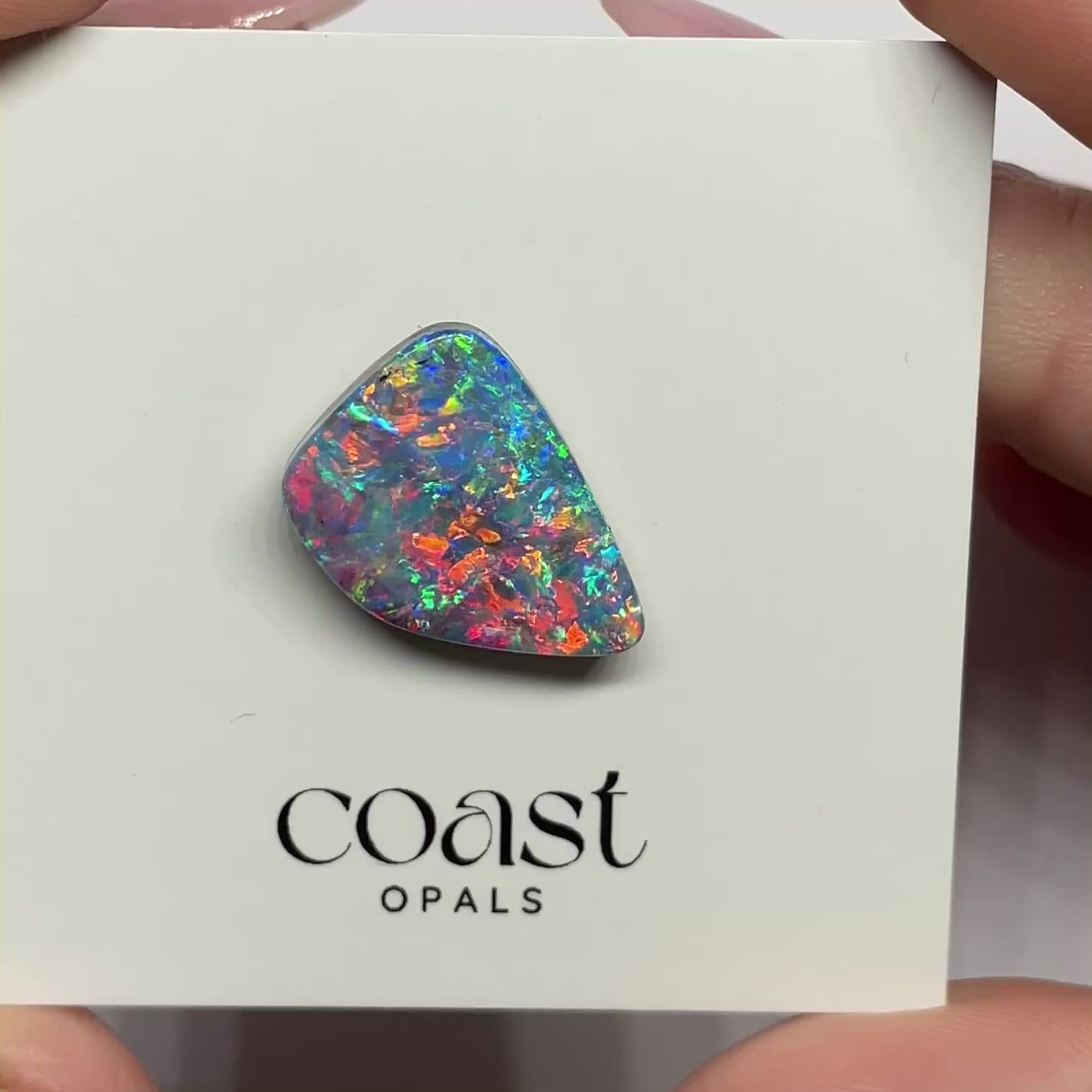 This 9.4ct Boulder Opal, measuring 16.43 x 13.7mm, showcases a dazzling kaleidoscope of vivid reds, greens, blues, and purples in a broad triangular cut. Its fiery play-of-color dances across the entire surface, making it a statement gemstone perfect for a centerpiece in high-end jewelry or a collector’s masterpiece.