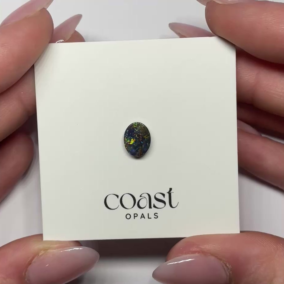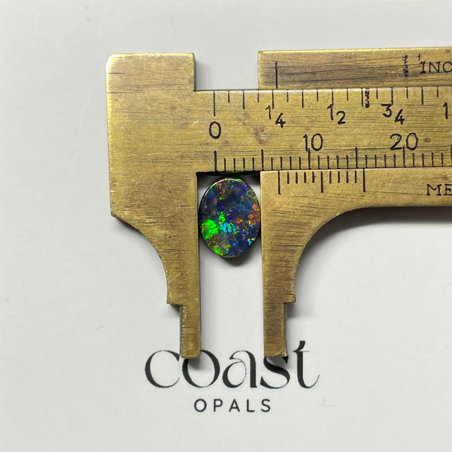 This 1.14ct oval boulder opal, measuring 8x6mm, displays an intense multi-colour fire. Brilliant flashes of green and blue intermingle with vivid orange and gold, creating a striking contrast against its dark background. Its balanced proportions and vibrant play-of-colour make it a versatile stone, ideal for rings or pendants with bold presence.