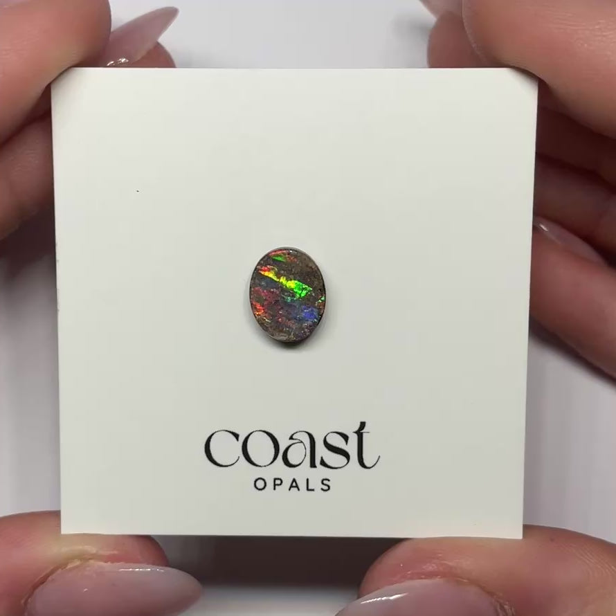 This 2.0ct oval boulder opal, measuring 10x8mm, captivates with its rare striped fire pattern. Brilliant flashes of red, orange, green, and violet streak diagonally across the stone, set against its earthy ironstone host. The bold play-of-colour and unique banding create a striking gemstone perfect for standout custom jewellery designs.
