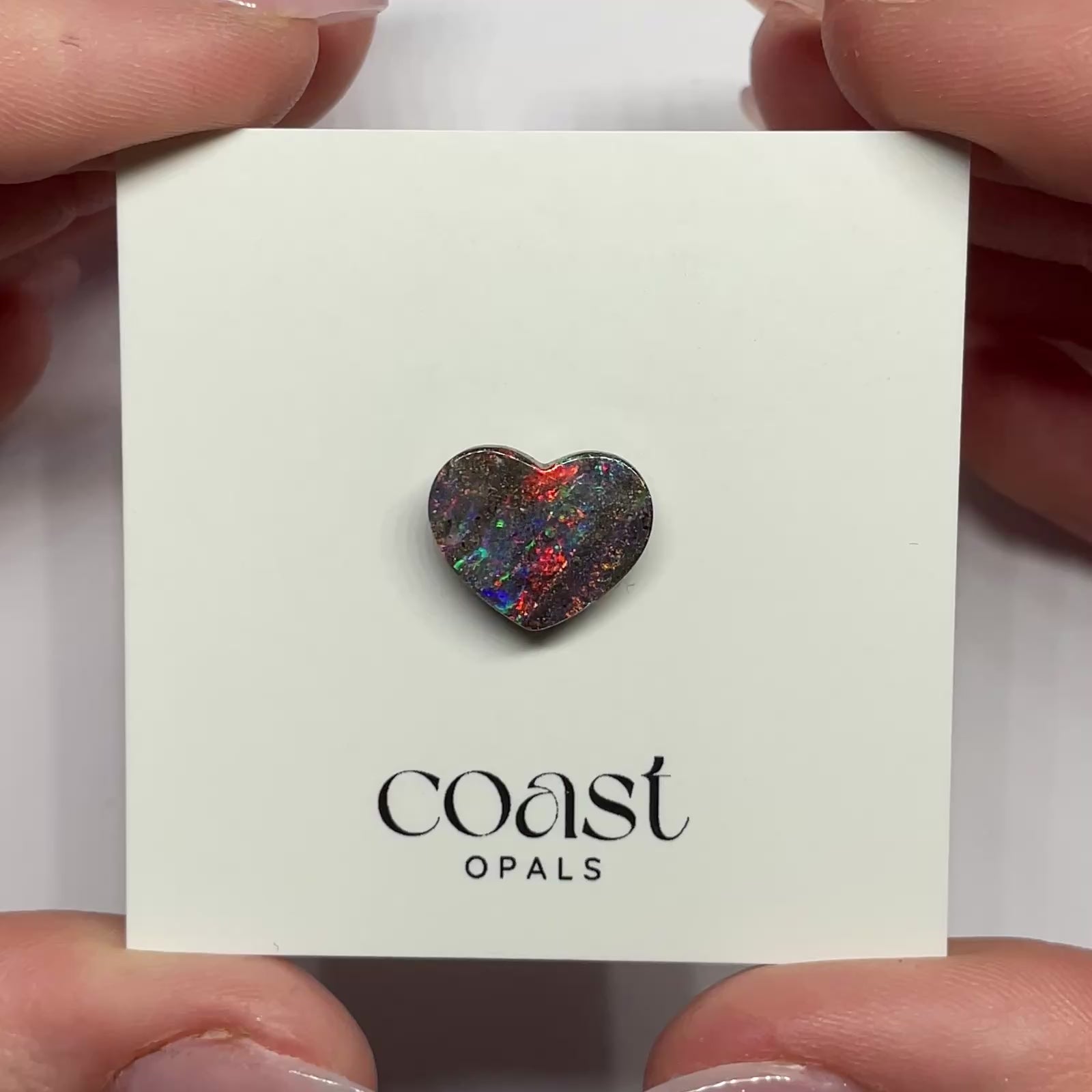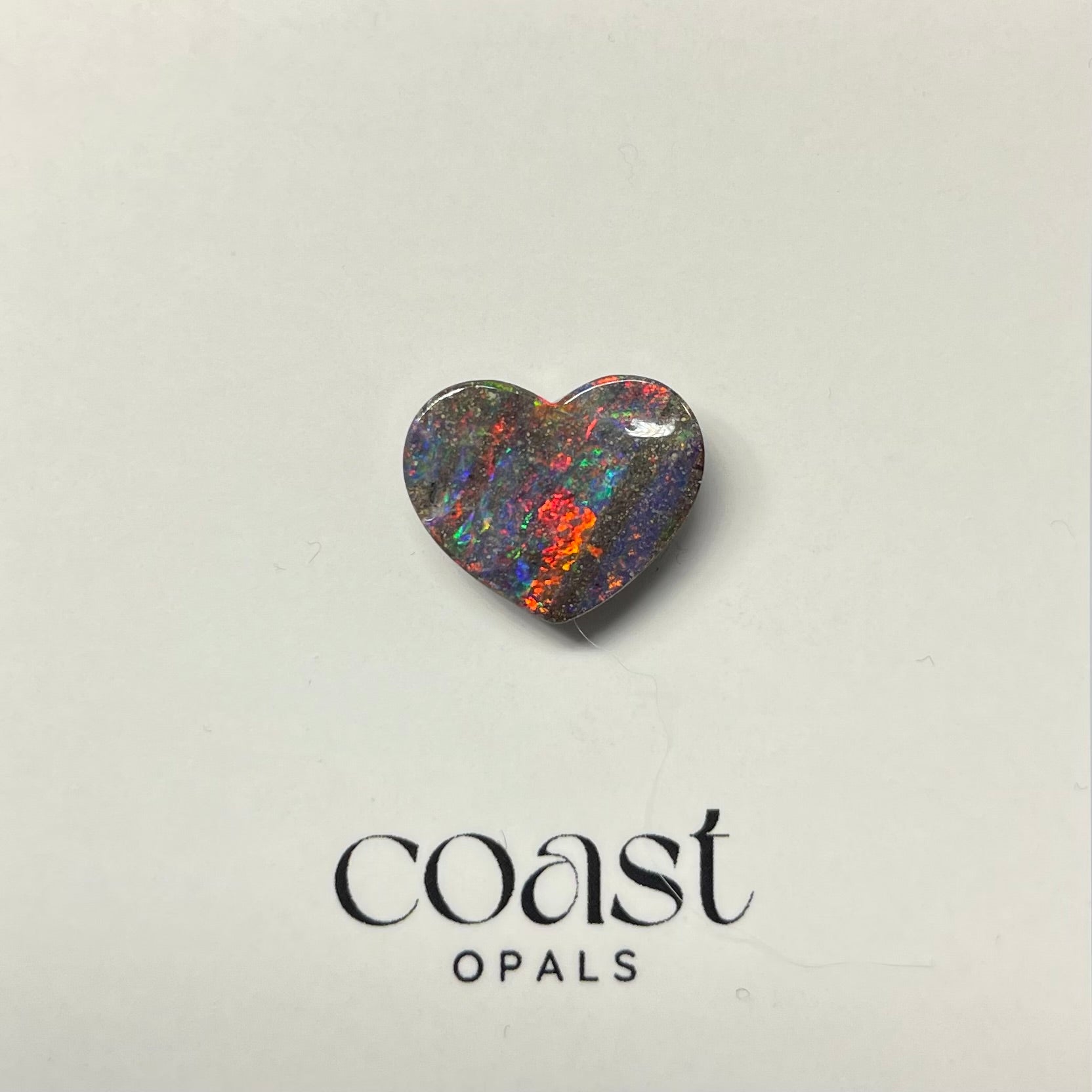 This 4.40ct heart-shaped boulder opal, measuring 13.44 x 11.11mm, radiates vibrant red, orange, green, and blue flashes across its dark ironstone backing. The natural heart cut enhances its romantic appeal, making it both a collector’s treasure and a perfect centrepiece for bespoke jewellery. A unique gemstone full of character.