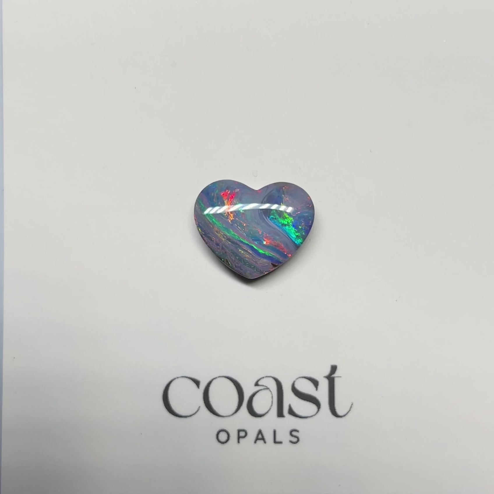 This 3.5ct heart-shaped boulder opal, measuring 9.8 x 11.8mm, reveals a dreamy interplay of swirling blues and violets with flashes of electric green and fiery red. Its unique banding creates a sense of movement across the stone, making it both vibrant and romantic — an unforgettable statement of natural beauty.